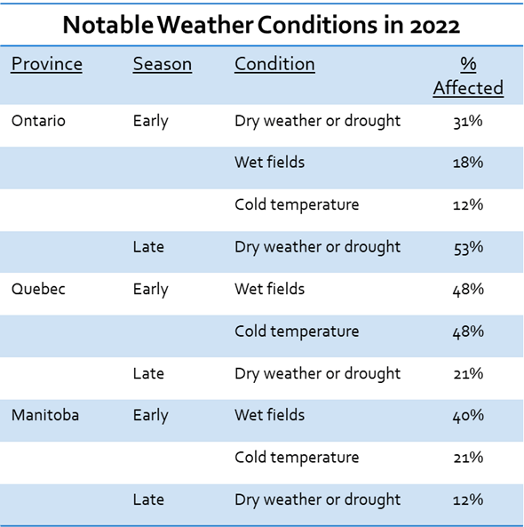In 2022, early and late season weather conditions negatively affected the crops of many growers in all three provinces, whereas; harvest weather conditions only affected a few in all three provinces in stark contrast to wet fields afflicting many soybean fields at harvest in 2021.