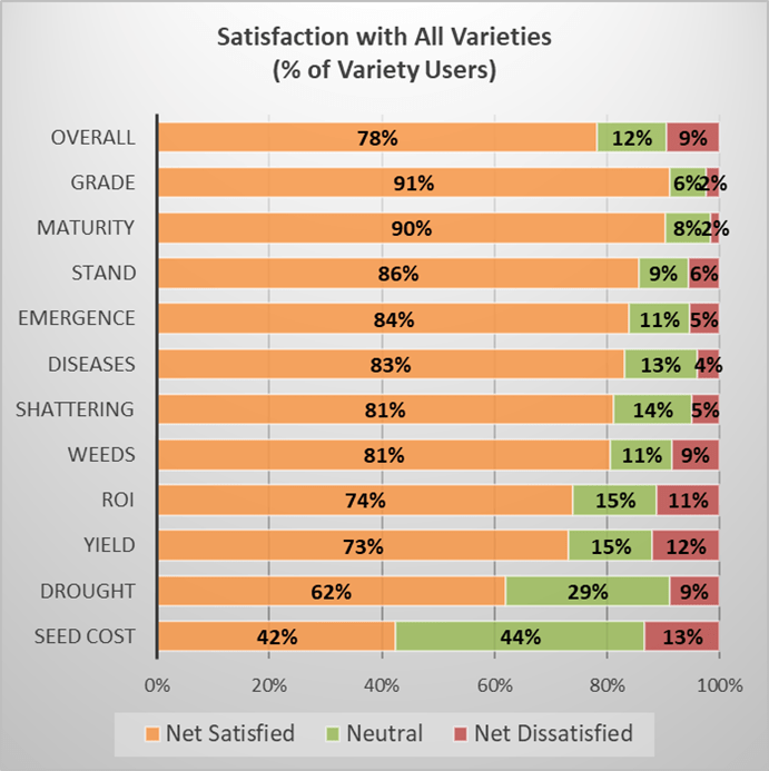 Satisfaction among the characteristics was highest with Grade, Maturity, Stand and Emergence, in that order, and satisfaction was lowest with Seed Cost, Drought (tolerance), Yield and ROI in that order.