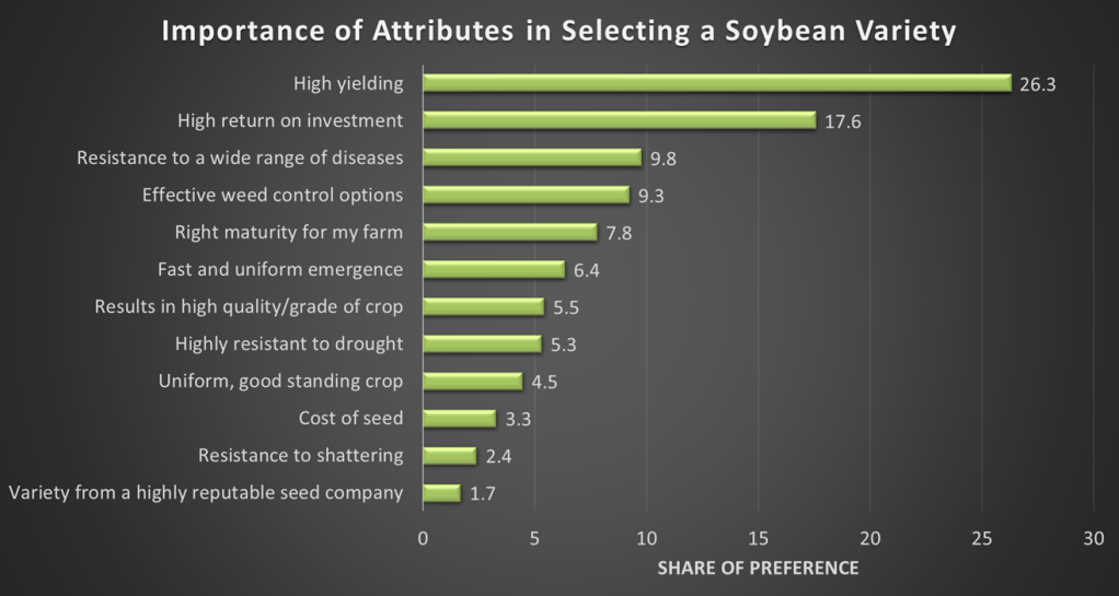 The most important factors, overall in 2022, in selecting a soybean variety were high yield and high return on investment (ROI) with share of preference 26% and 17% respectively, however both declined from 2021 from 32% and 26% respectively.